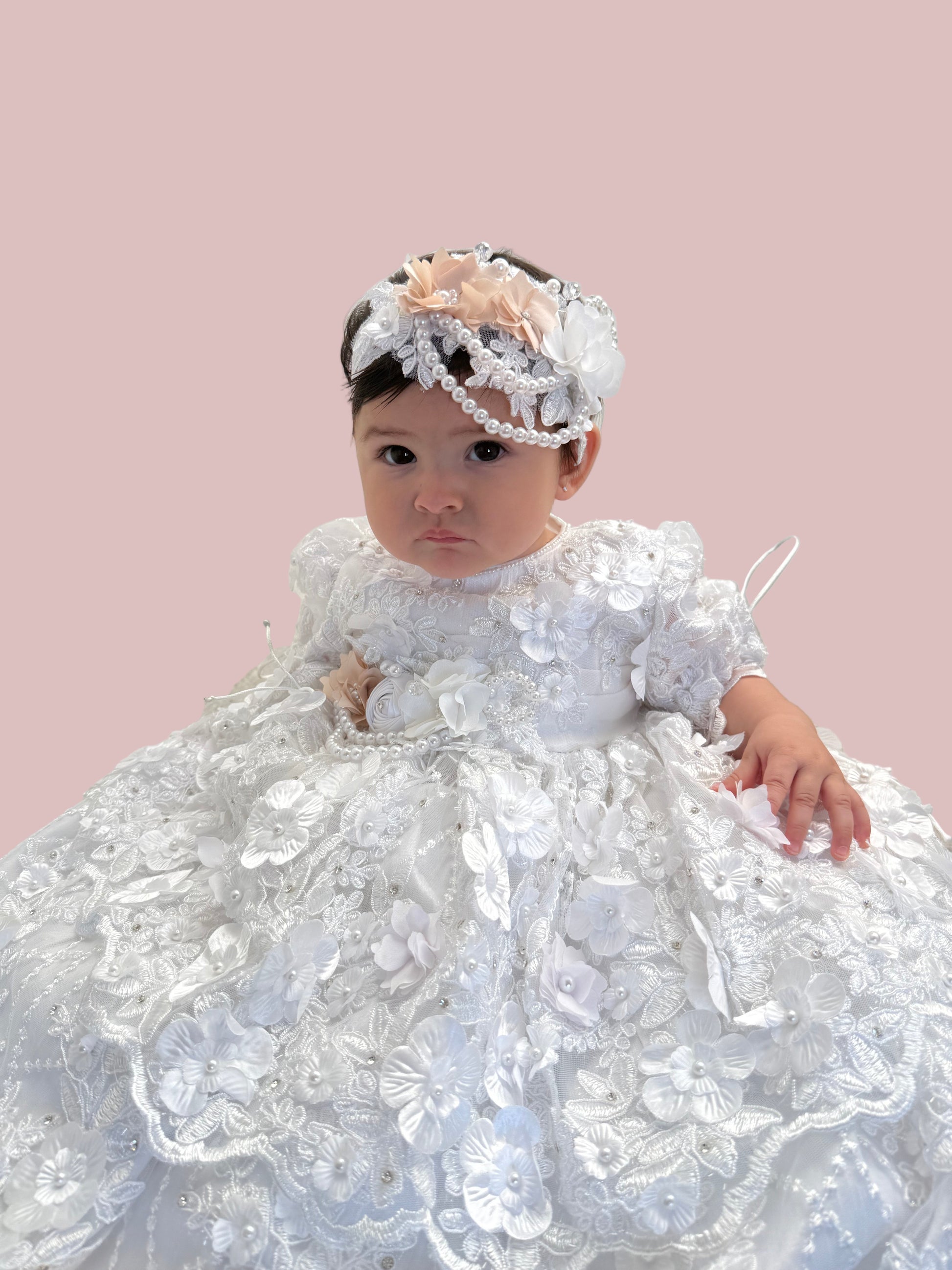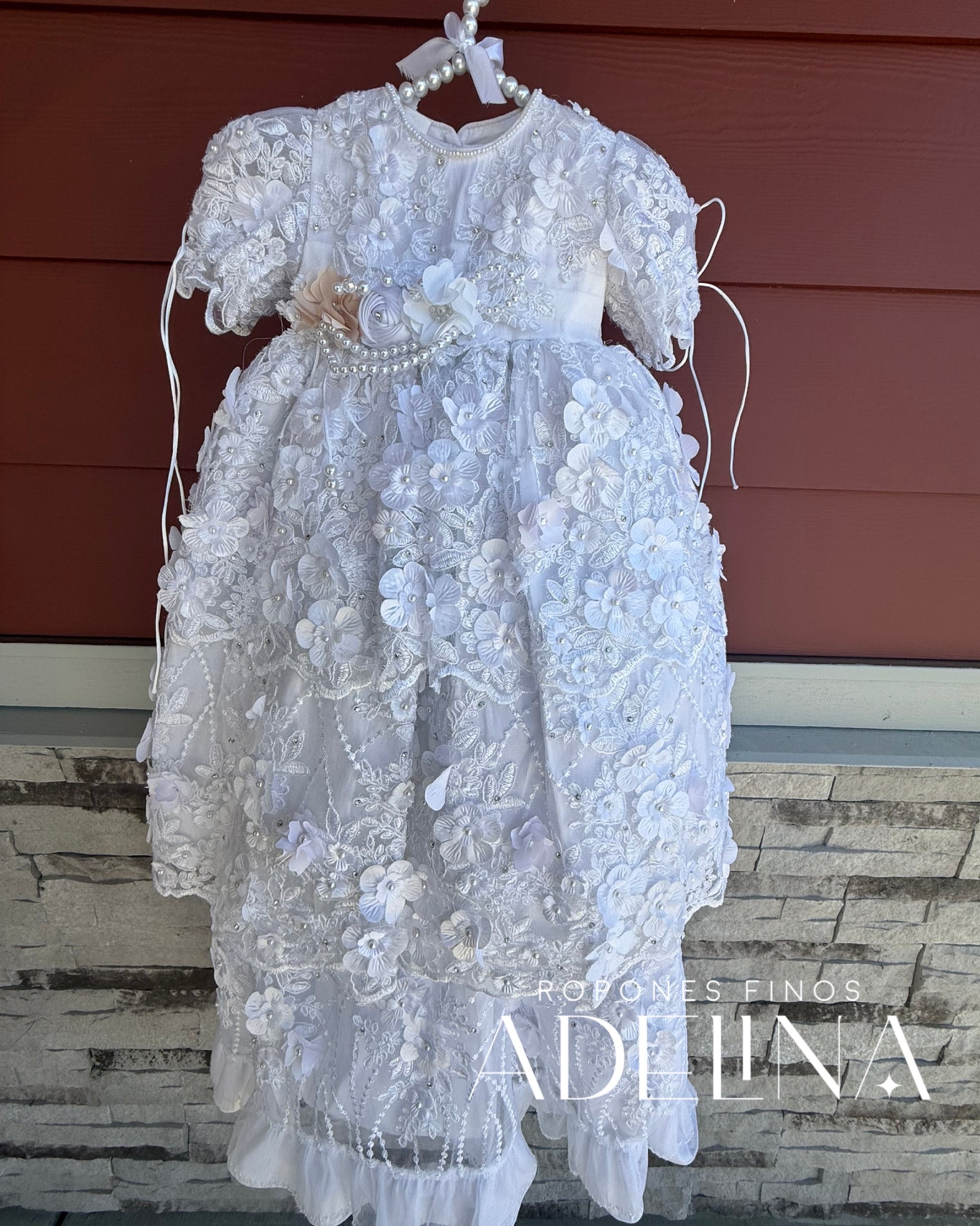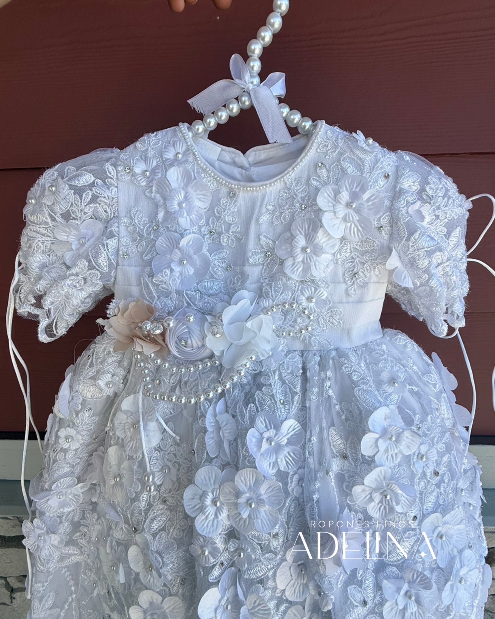 Elegant full-length Christening gown for girls, HANDMADE, features an embroidered tulle. Elegant and unique style