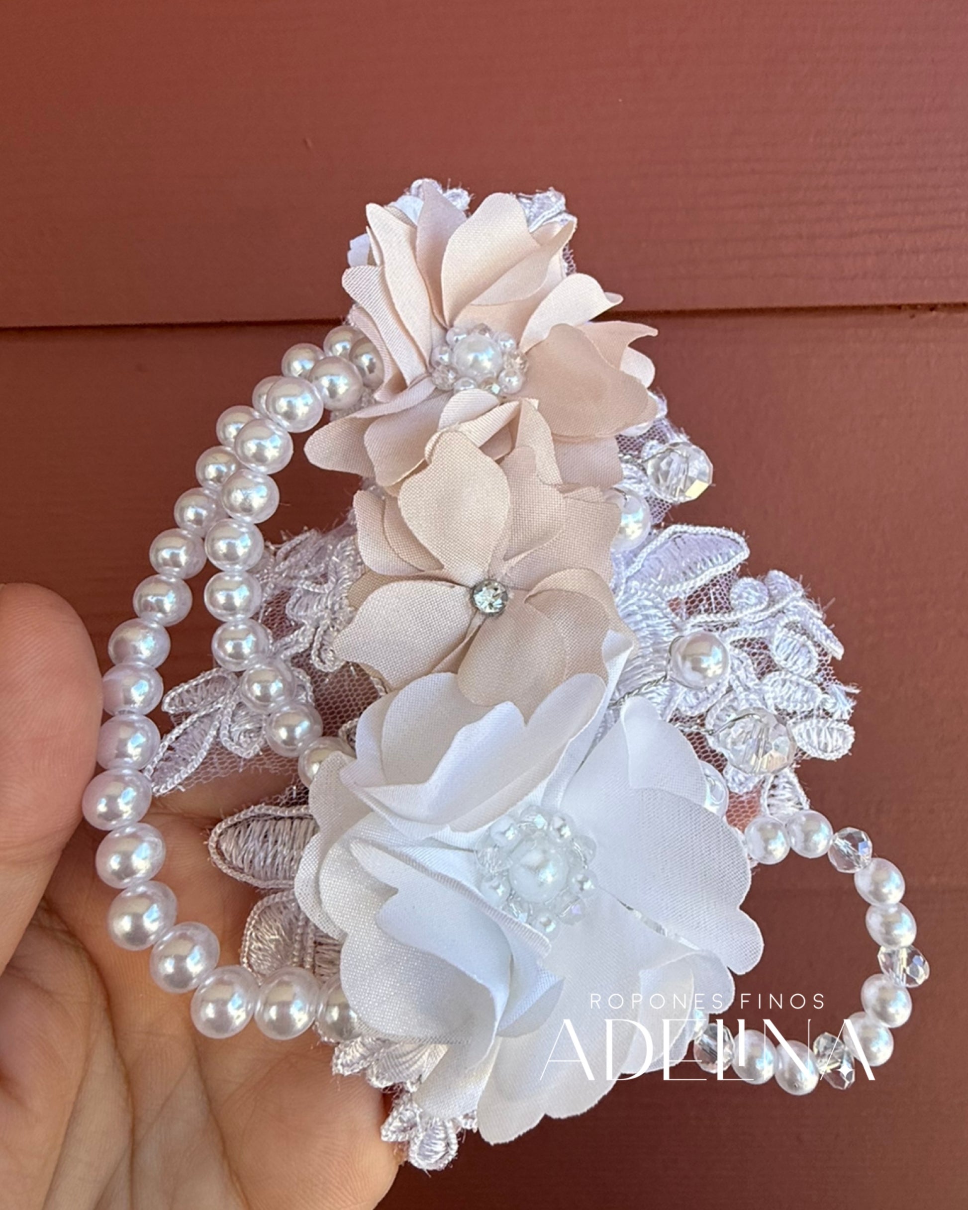 The gown is available in white covered with hand-beaded lace. The sleeve is laced with cotton backing.