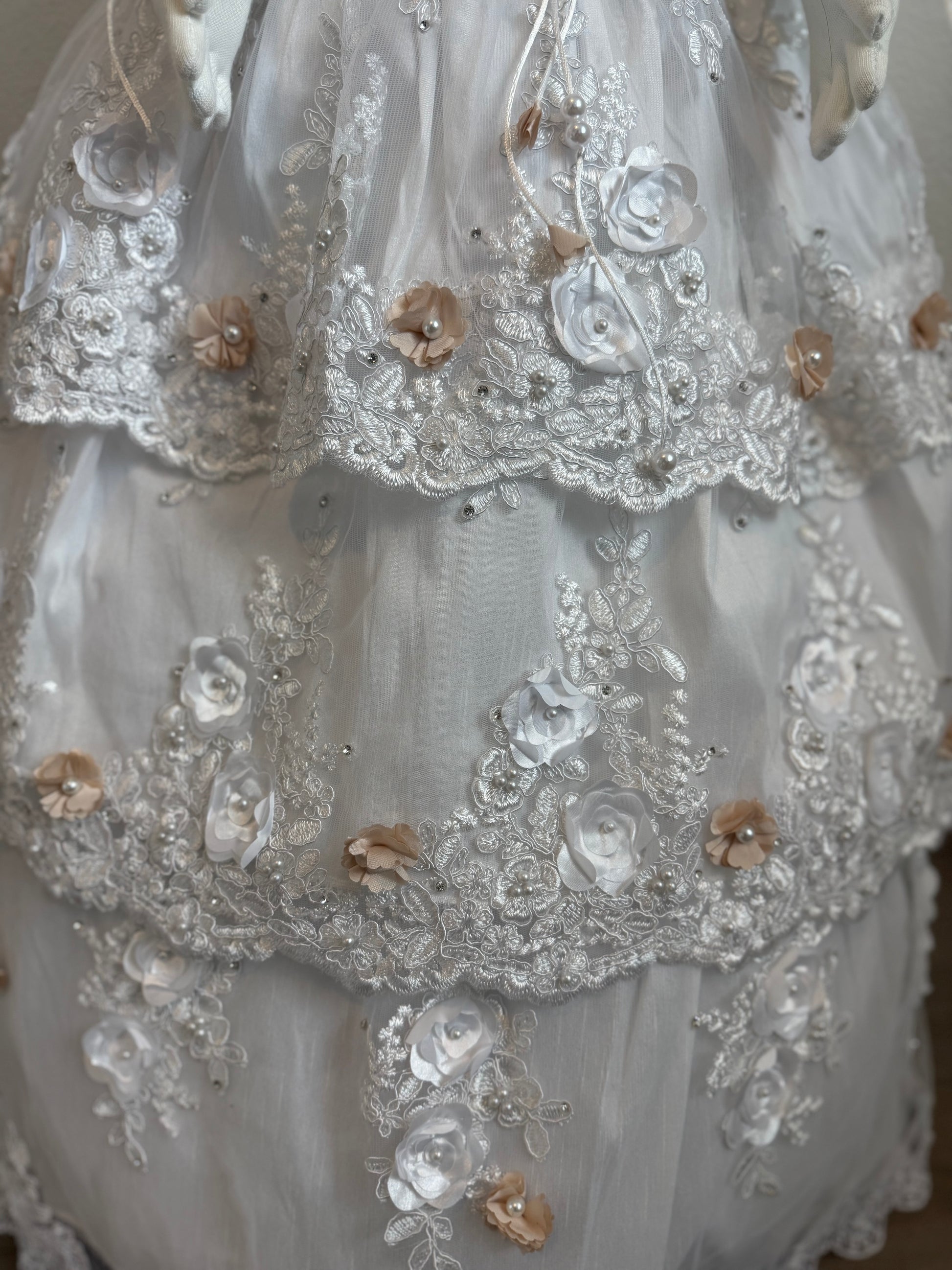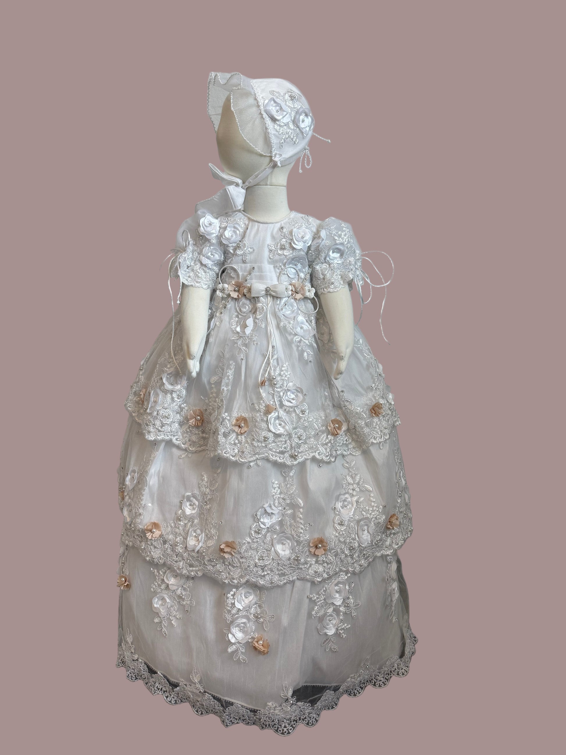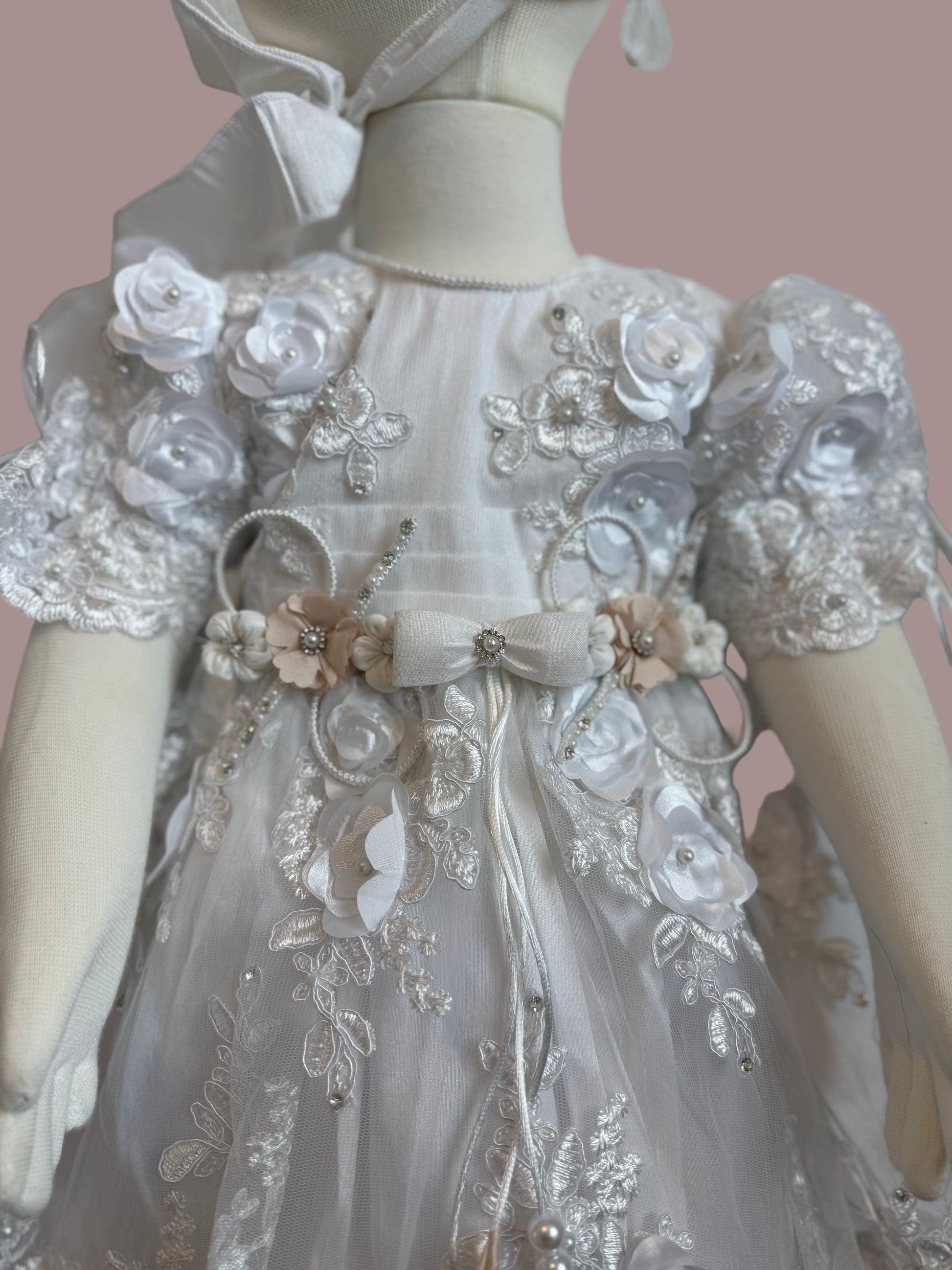Elegant full-length Christening gown for girls, HANDMADE, features an embroidered tulle. Elegant and unique style