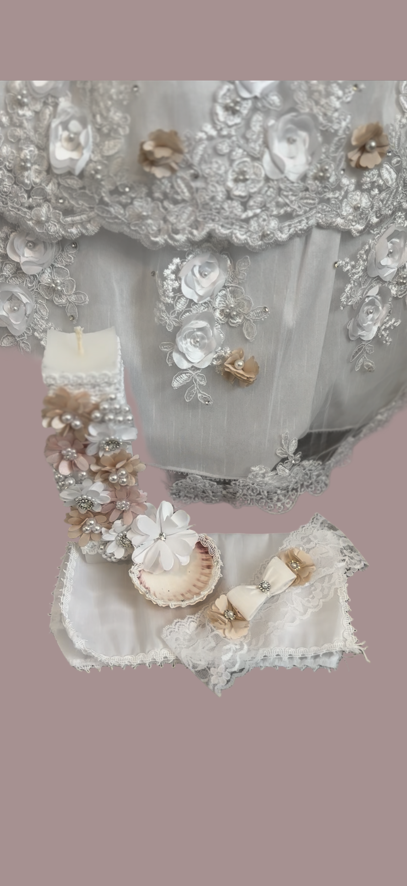 Long Underdress, Short Detachable Dress, Matching Bonnet, Matching Headband, and Candle Set.