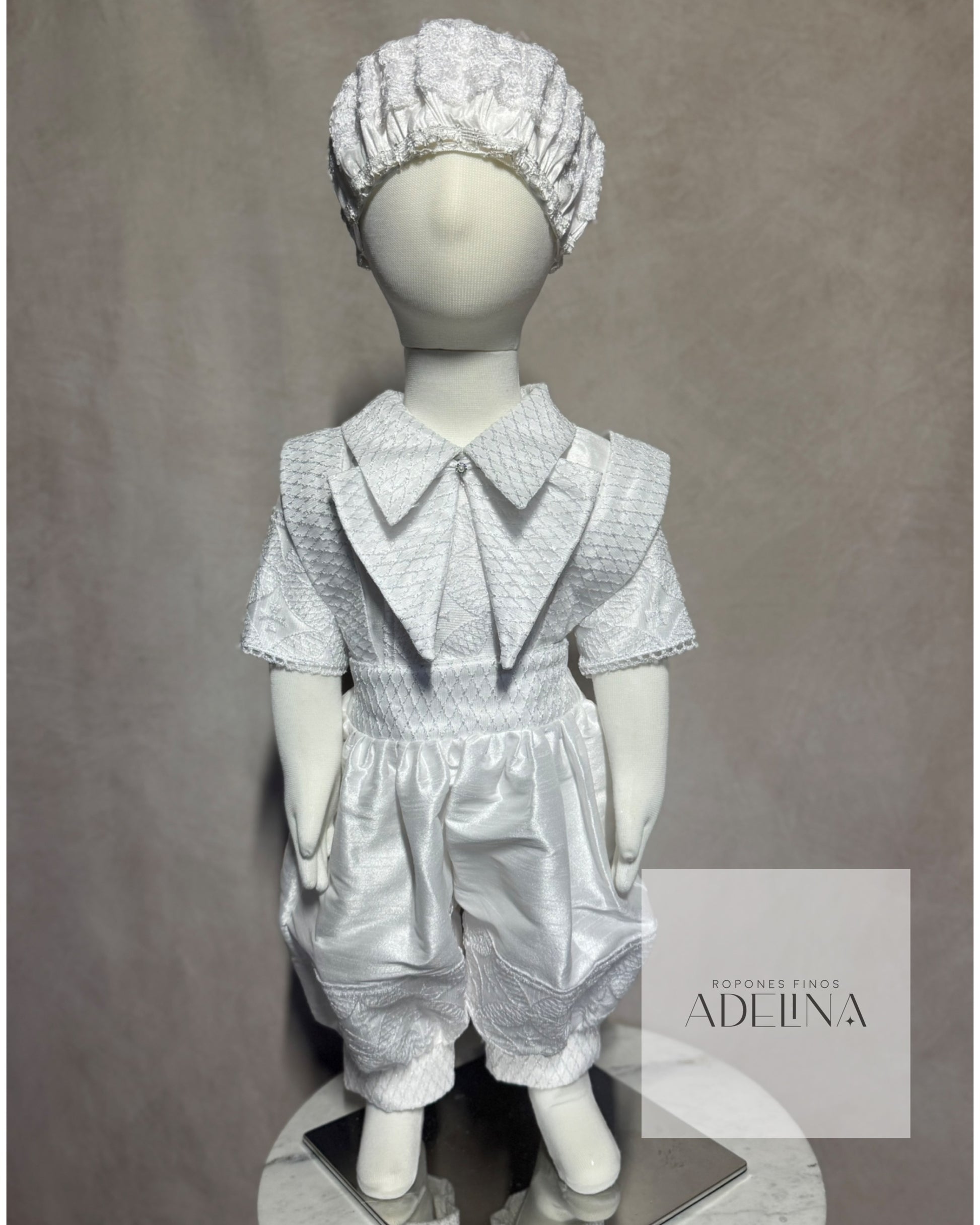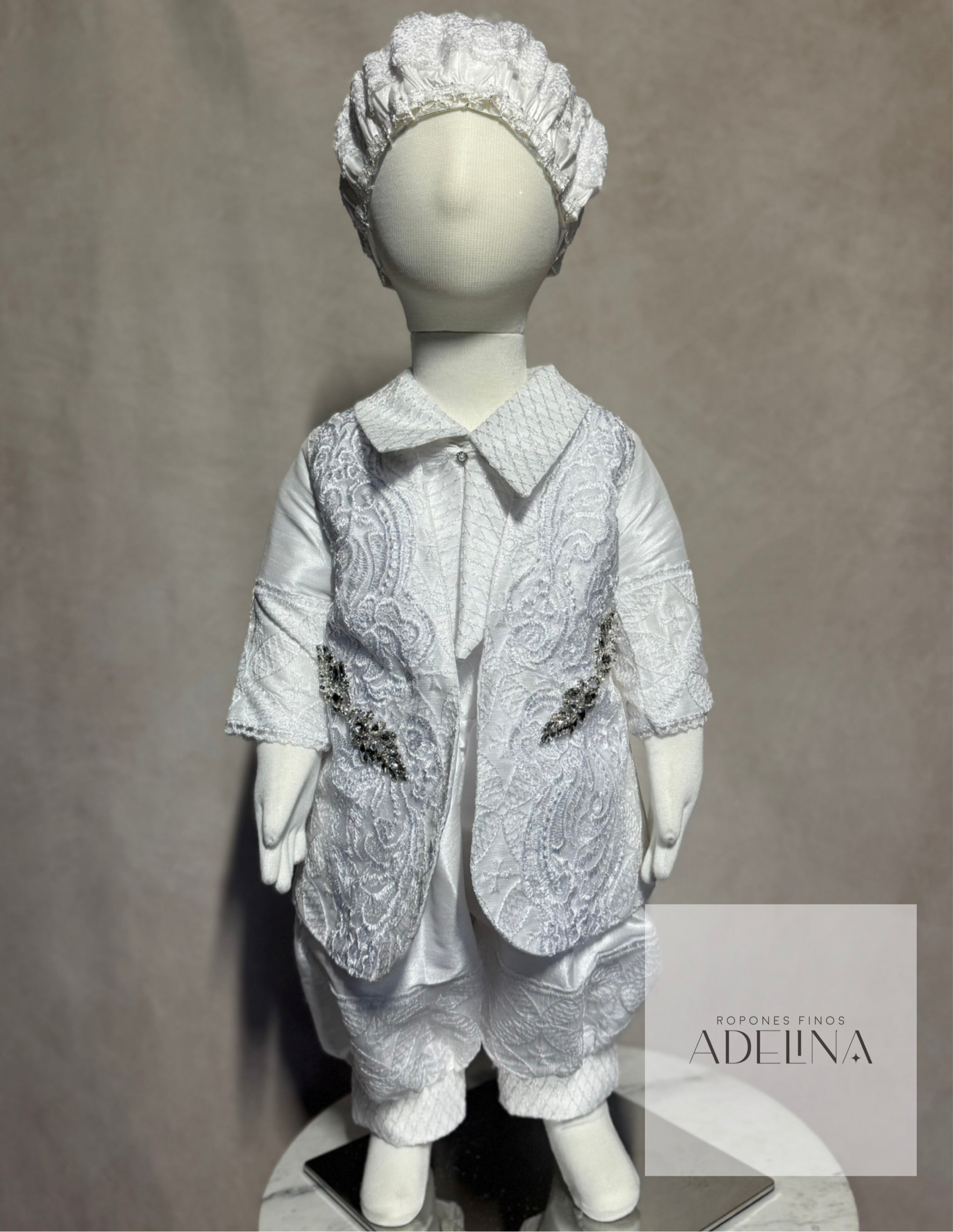 - 4 piezas: Camisa, Pantalón, Saco, y Gorrito