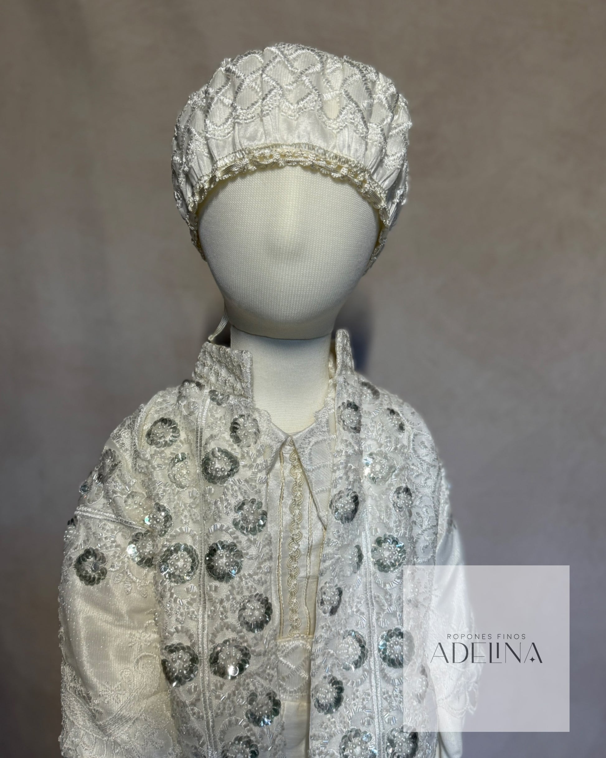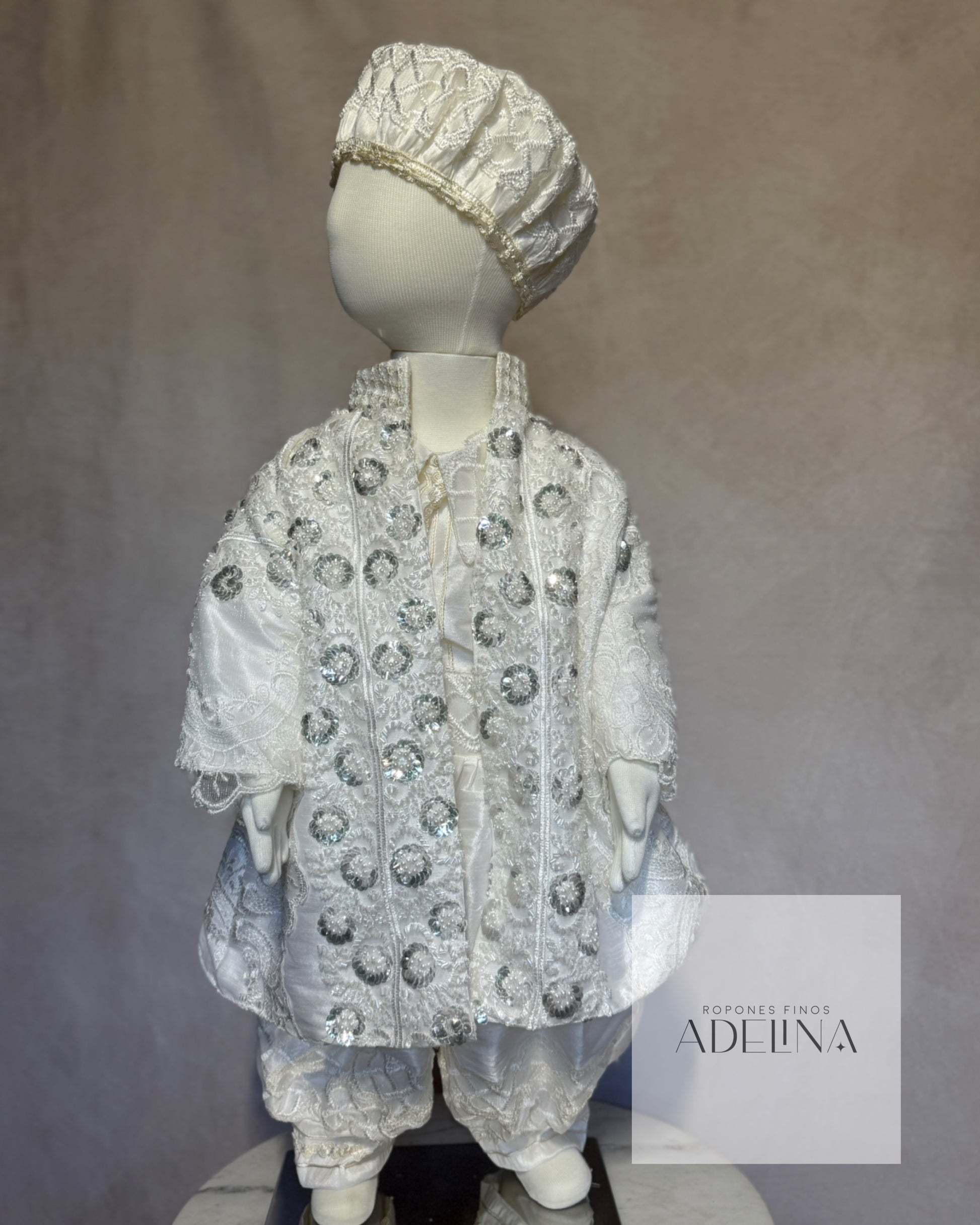 - 4 piezas: Camisa, Pantalón, Saco, y Gorrito